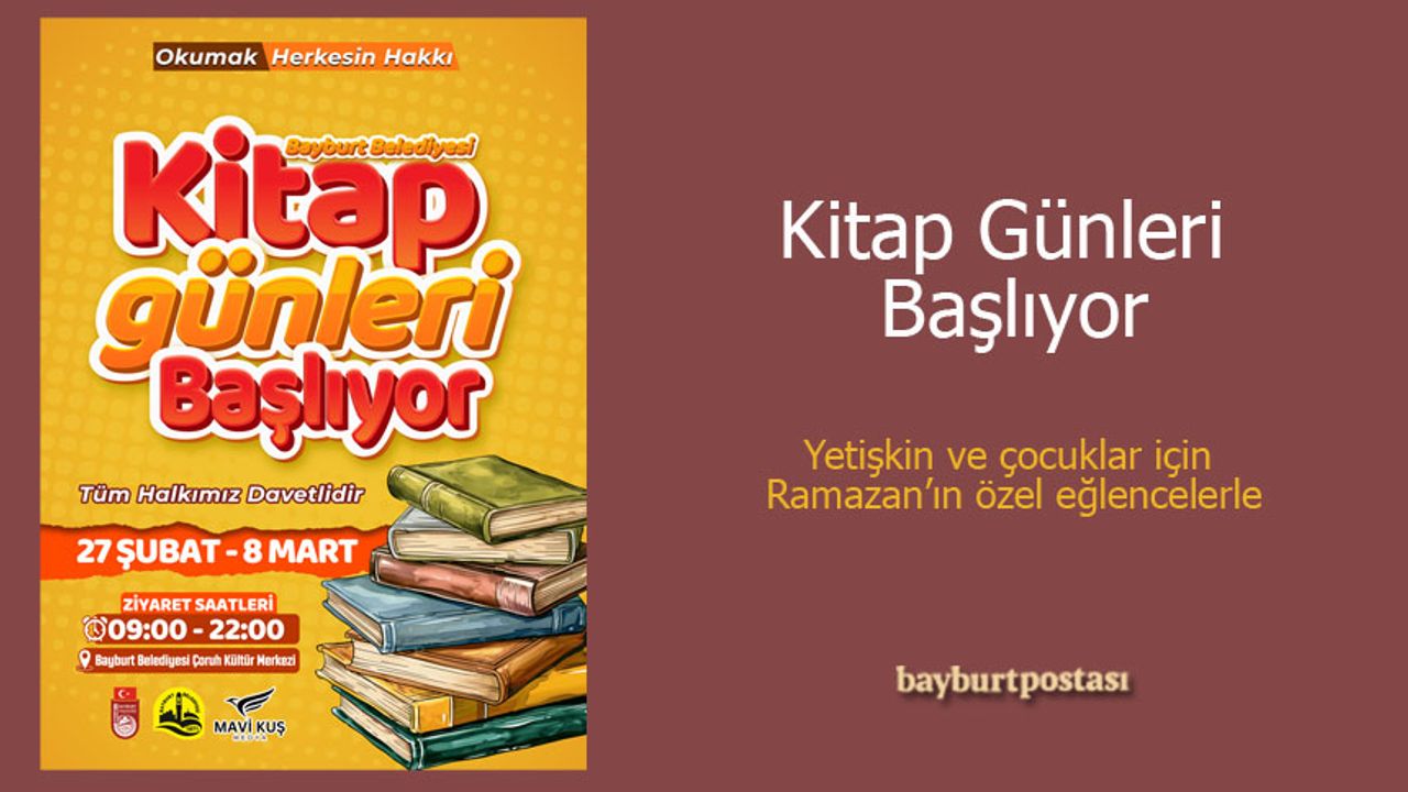 Bayburt Postası - Bayburt Belediyesi Çoruh Kültür Merkezi’nde gerçekleştirilecek olan etkinlikte, çok sayıda yayınevi stant açarak okurları en sevilen eserlerle buluşturacak. 10 gün sürecek olan organizasyon, sabah 09.00’dan gece 22.00’ye kadar her yaştan ziyaretçiye açık olacak.