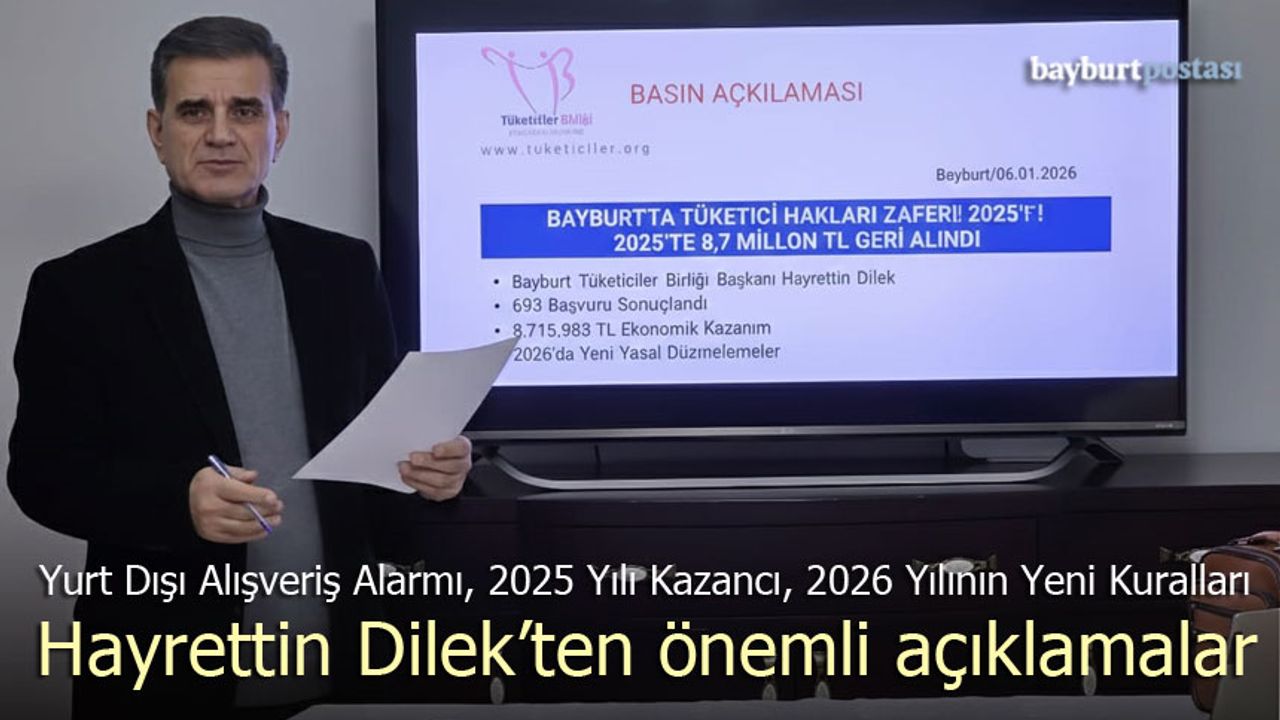 Bayburt Postası - Geçtiğimiz yıl karara bağlanan dosyalardan sağlanan ekonomik kazanım 8,7 milyon TL’yi aşarken, Başkan Dilek sınır ötesi e-ticaret sitelerine karşı vatandaşları uyardı.