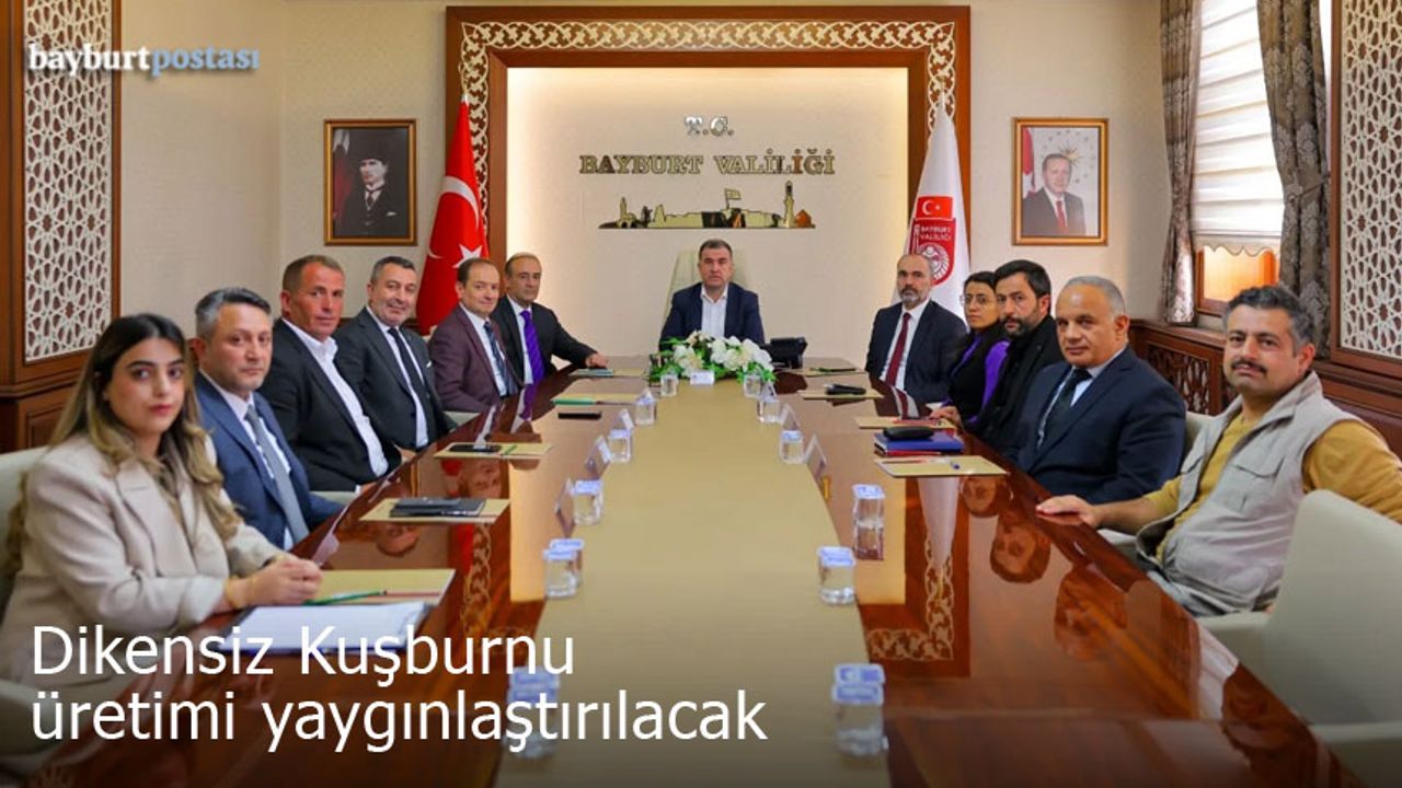 Bayburt Postası - Valilik toplantı salonunda gerçekleşen toplantıda, dikensiz kuşburnu üretiminin Bayburt'ta yaygınlaştırılması ve bu alanda yürütülecek projelerin planlanması detaylıca ele alındı. Toplantının temel gündem maddeleri arasında Bayburt’un tarımsal üretim potansiyelinin geliştirilmesi, kırsal kalkınmanın desteklenmesi ve aromatik bitki çeşitliliğinin artırılmasına yönelik planlamalar yer aldı.