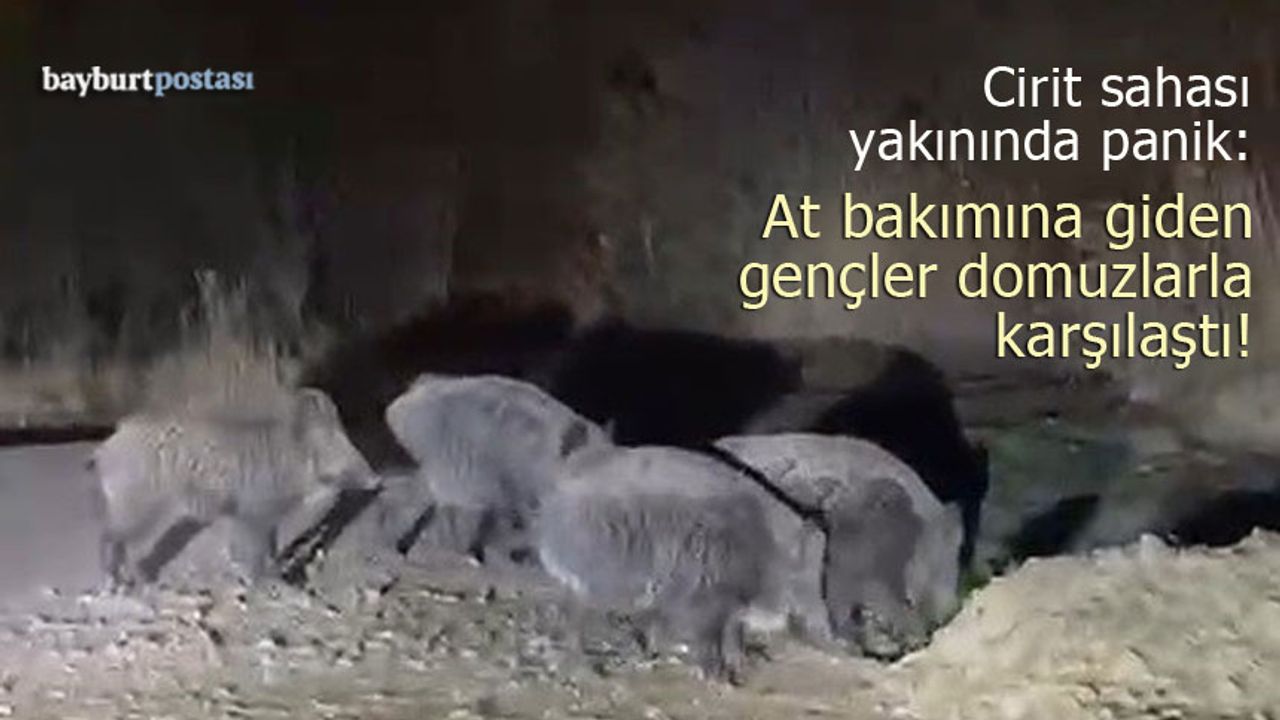 Bayburt Postası - Her akşam olduğu gibi atlarının bakımı için ahıra giden Muhammet Dağ ve Yusuf Yılmaz, saat 23.00 sıralarında cirit sahası yakınlarında araçlarıyla ilerlerken çevreden gelen bir ses duydu. Araçlarının farlarını sesin geldiği yöne çeviren iki arkadaş, bir anda önlerinde beliren yaklaşık 10 domuzu görünce büyük bir şaşkınlık yaşadı.