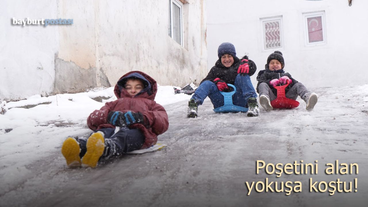 Bayburt Postası - Dondurucu soğuğa aldırış etmeyen minikler, poşetler ve plastik kayak tahtalarıyla gönüllerince eğlendi.