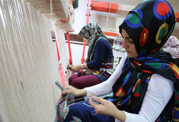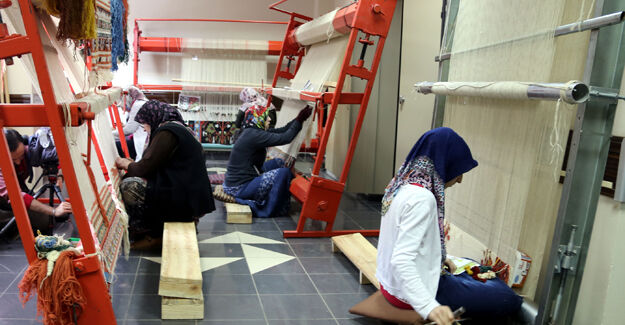 Belediye bünyesindeki Sanatsal ve Mesleki Eğitim Kurslarına (ESMEK) katılıp eğitim alan kadınlar, ipliği yüzde yüz koyun yününden, kimyasal olmayan ağaç kökleri ve taştan elde edilmiş boyalarla yapılan kilimlerin dokunması için kolları sıvadı.