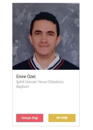 Aşağıdaki linkten yarışmaya katılarak, “Yılın En Sıra Dışı Öğretmeni” ödülünü Bayburt’a ve de Şehit Gürcan Yavuz Ortaokulu’na taşıyabiliriz. Oylama için son tarih: 31 Ekim 2016